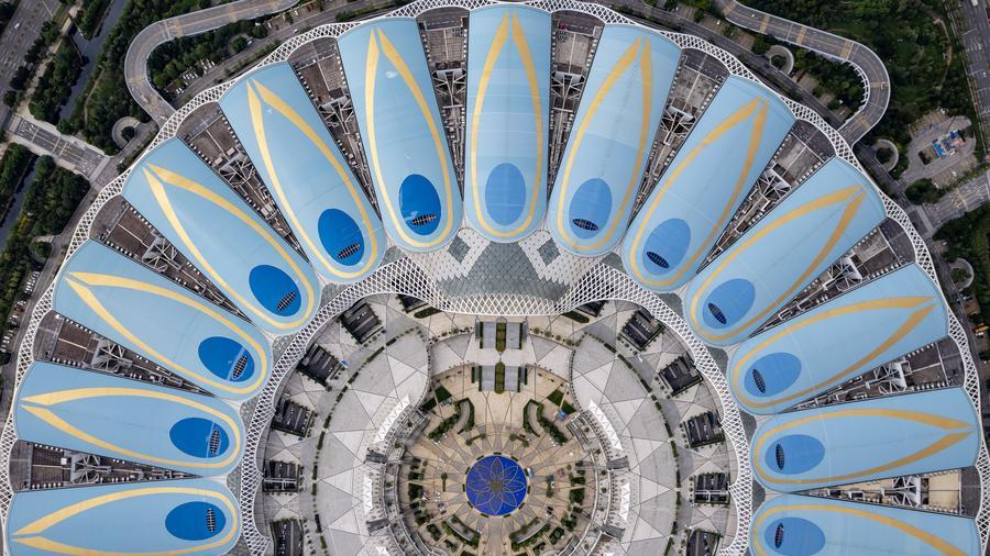 This aerial photo taken on Aug. 7, 2023 shows a view of Kunming Dianchi International Convention and Exhibition Center, the venue for the seventh China-South Asia Expo in Kunming, southwest China's Yunnan Province. (Xinhua/Chen Xinbo)
