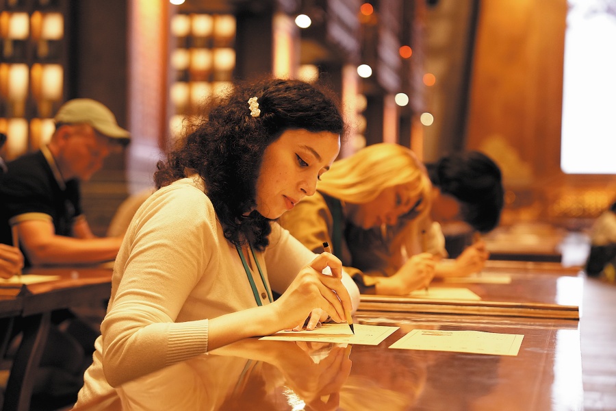 Young people from overseas practice calligraphy during the Confucius Cultural Festival. [Photo provided to CHINA DAILY]