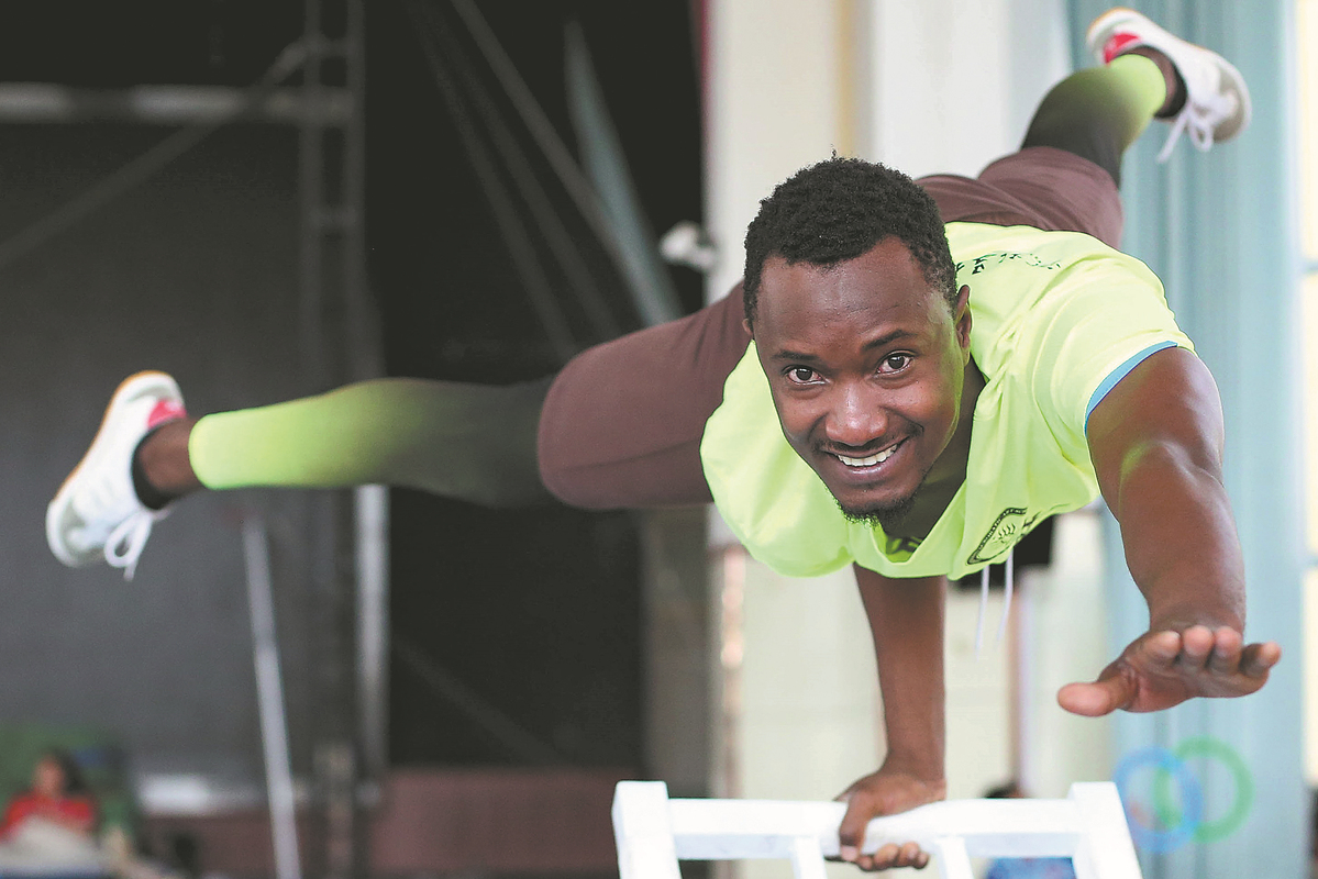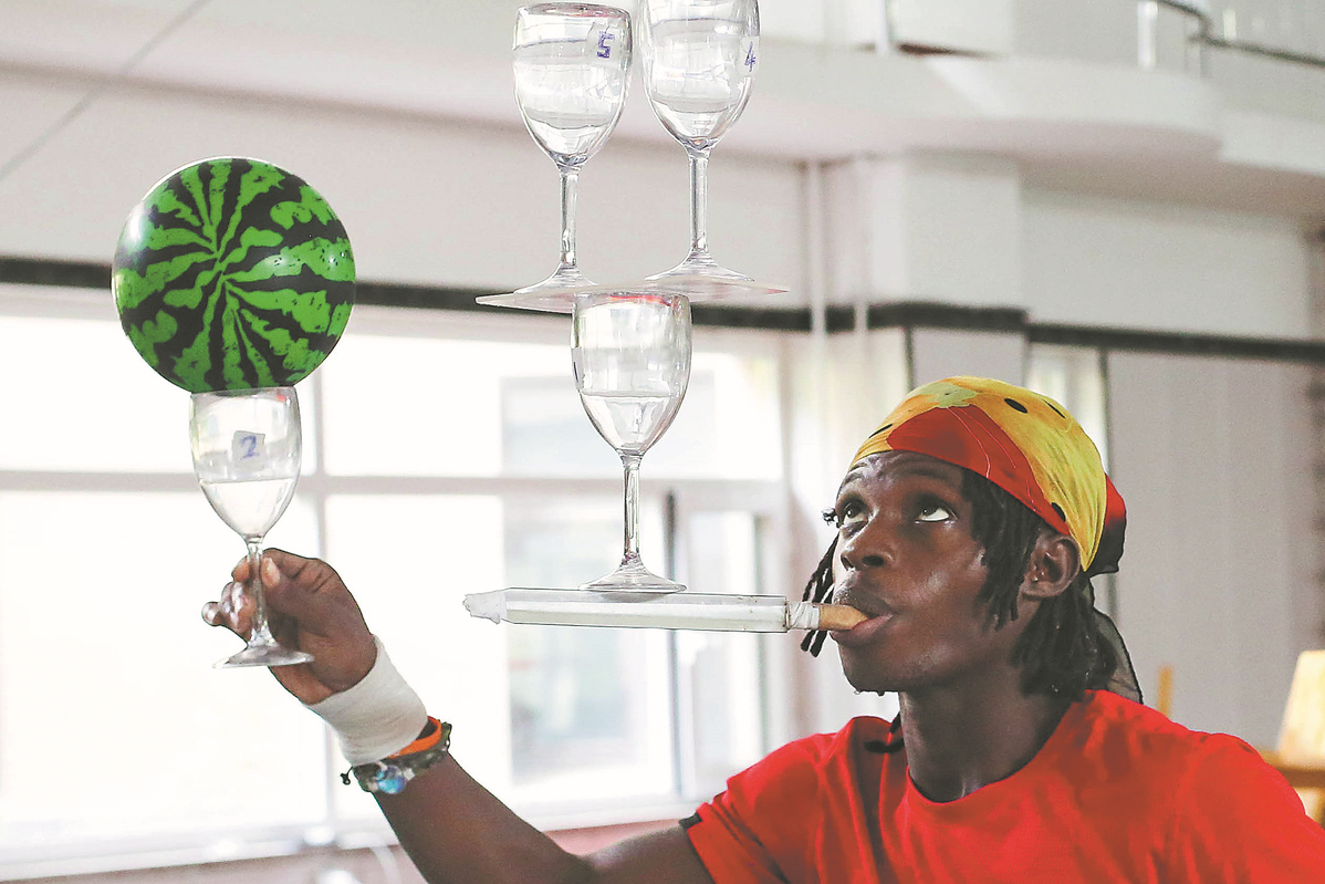 An acrobat from Sierra Leone demonstrates his steady hand and composure at Wuqiao Acrobatic Art School on Aug 23.