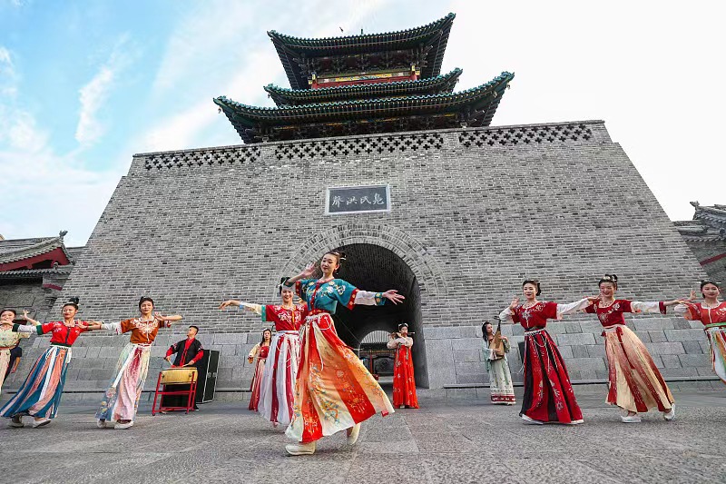 Dancers perform in front of the Bell Tower on Zhonglou Street, Taiyuan, Shanxi Province. /CFP