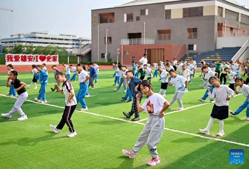 Students do exercise at the Xiong'an campus of the Shijiahutong Elementary School in Xiong'an New Area, north China's Hebei Province, May 21, 2024. (Xinhua/Mu Yu)