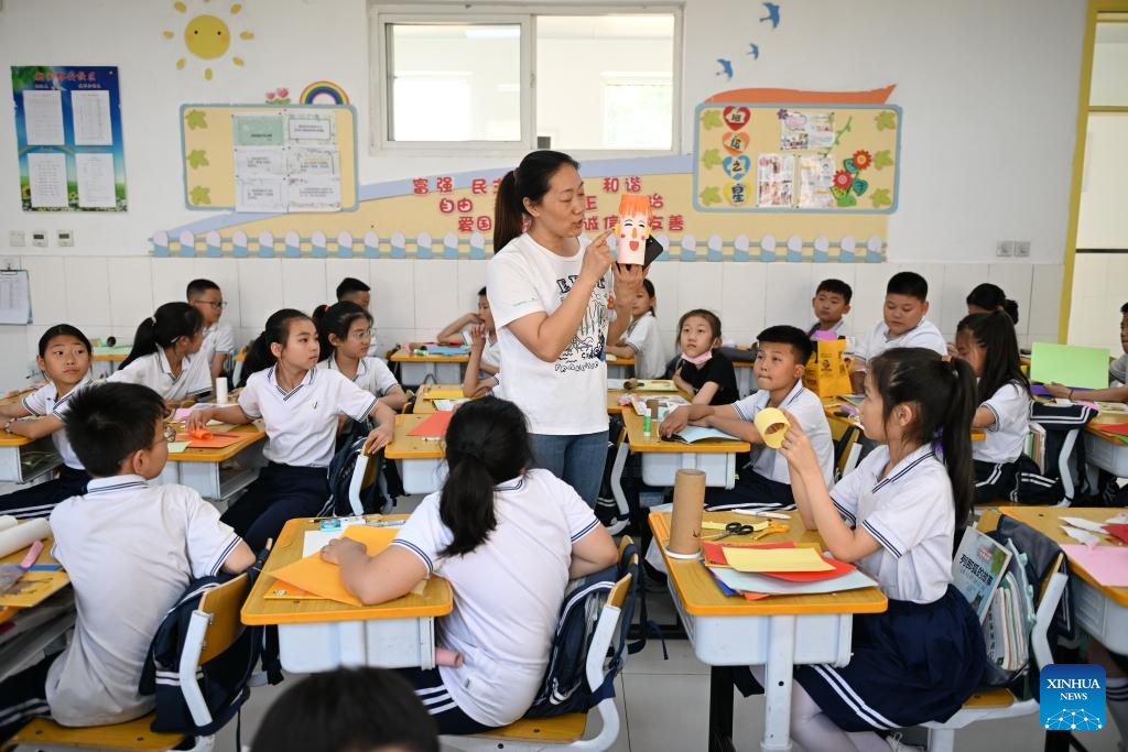 A teacher demonstrates as students look on in a handicraft class at a primary school in Xiong'an New Area, north China's Hebei Province, May 21, 2024. (Xinhua/Mu Yu)
