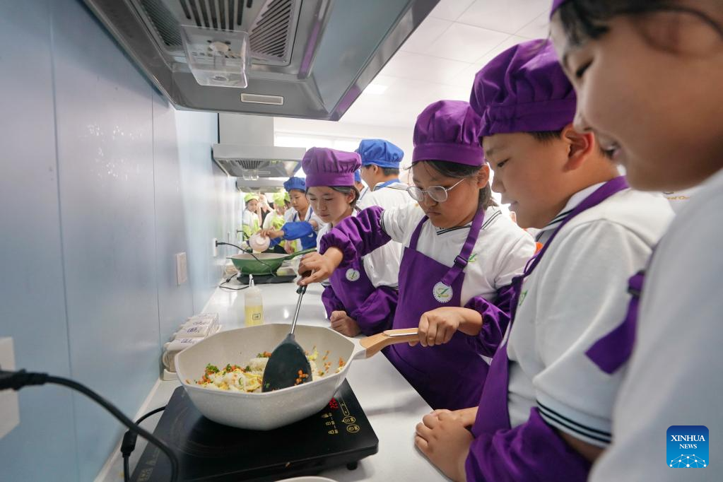 Students cook during a culinary class at a primary school in Xiong'an New Area, north China's Hebei Province, May 22, 2024. (Xinhua/Mu Yu)