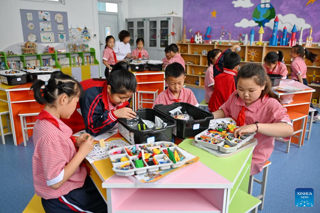 Students assemble robots at an activity room of a school in Xiong'an New Area, north China's Hebei Province, May 24, 2024. (Xinhua/Mu Yu)