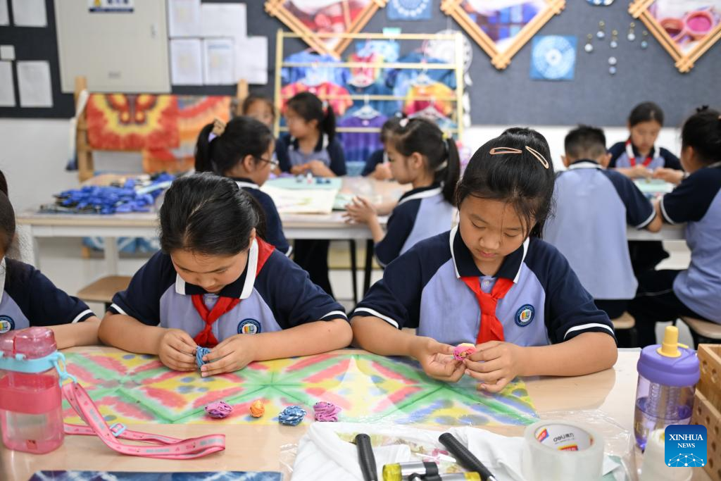 Students make batik works at a school in Xiong'an New Area, north China's Hebei Province, May 23, 2024. (Xinhua/Mu Yu)