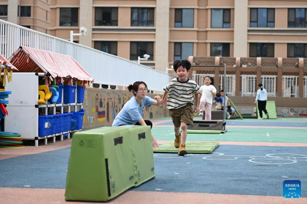 Students participate in outdoor activities at a kindergarten in Xiong'an New Area, north China's Hebei Province, May 23, 2024. (Xinhua/Mu Yu)