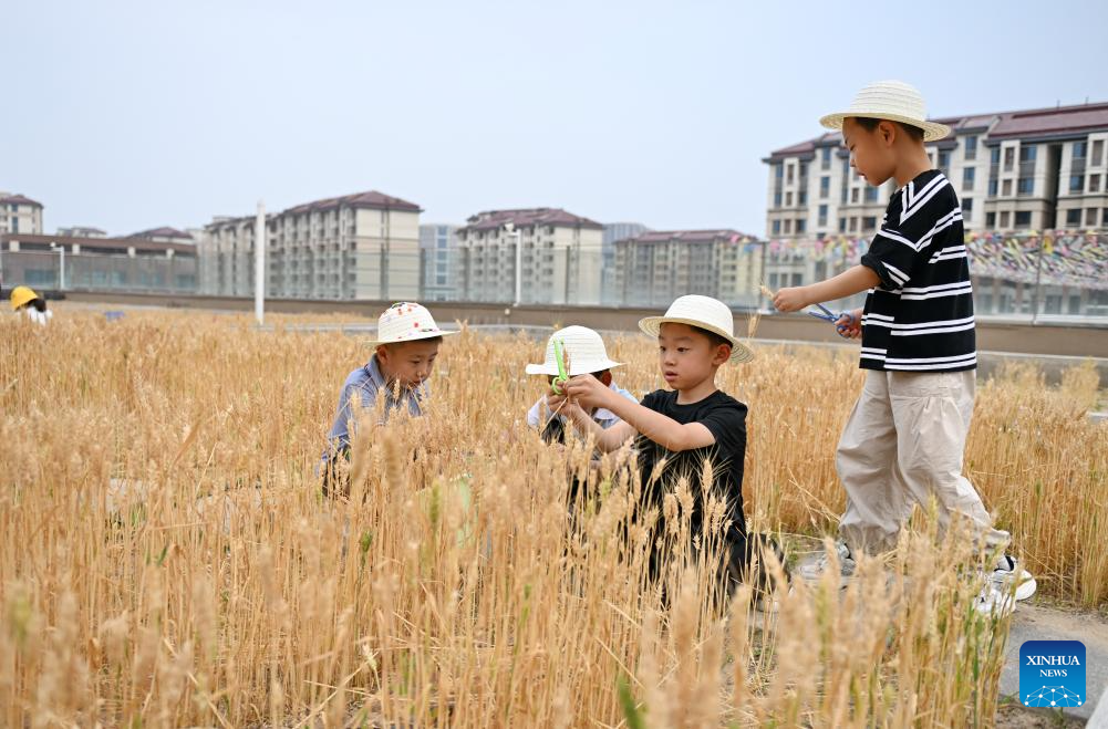 Students harvest wheat at a school farm of a kindergarten in Xiong'an New Area, north China's Hebei Province, May 23, 2024. (Xinhua/Mu Yu)