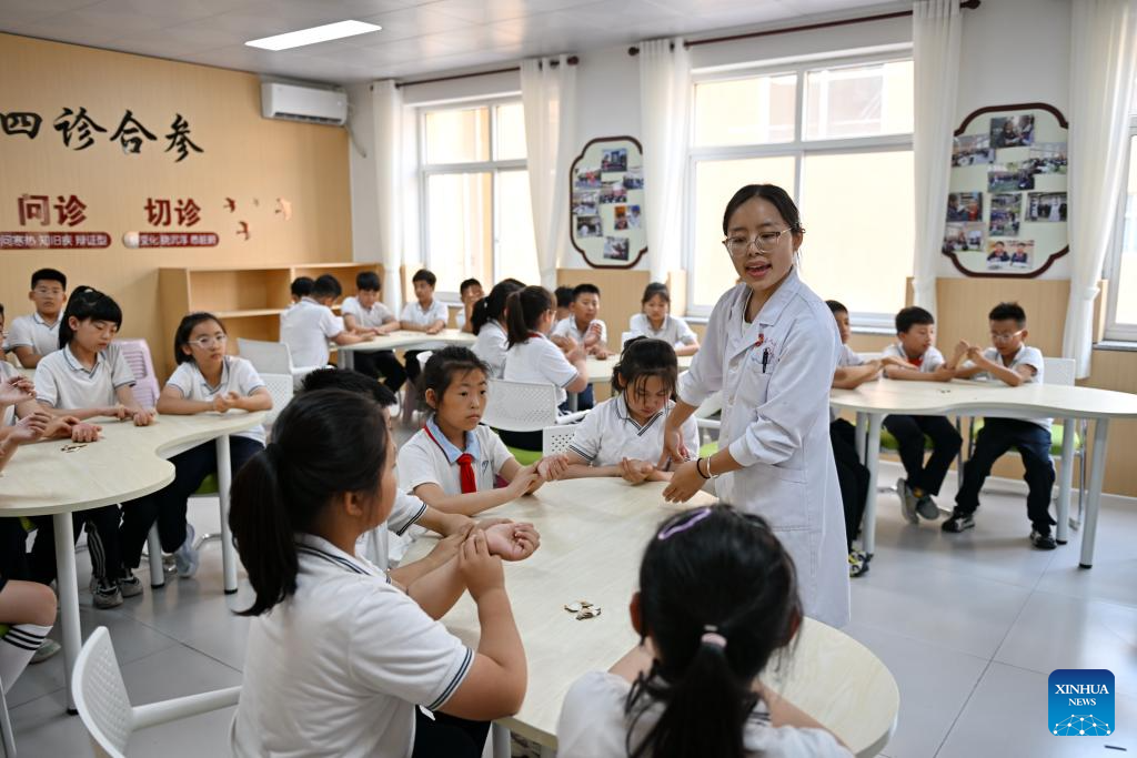 Students learn about traditional Chinese medicine knowledge at a primary school in Xiong'an New Area, north China's Hebei Province, May 22, 2024. (Xinhua/Mu Yu)
