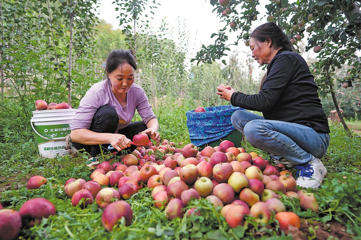 Two farmers divide apples of various sizes into different categories at an orchard in Zhaotong in September. CHEN XINBO/XINHUA