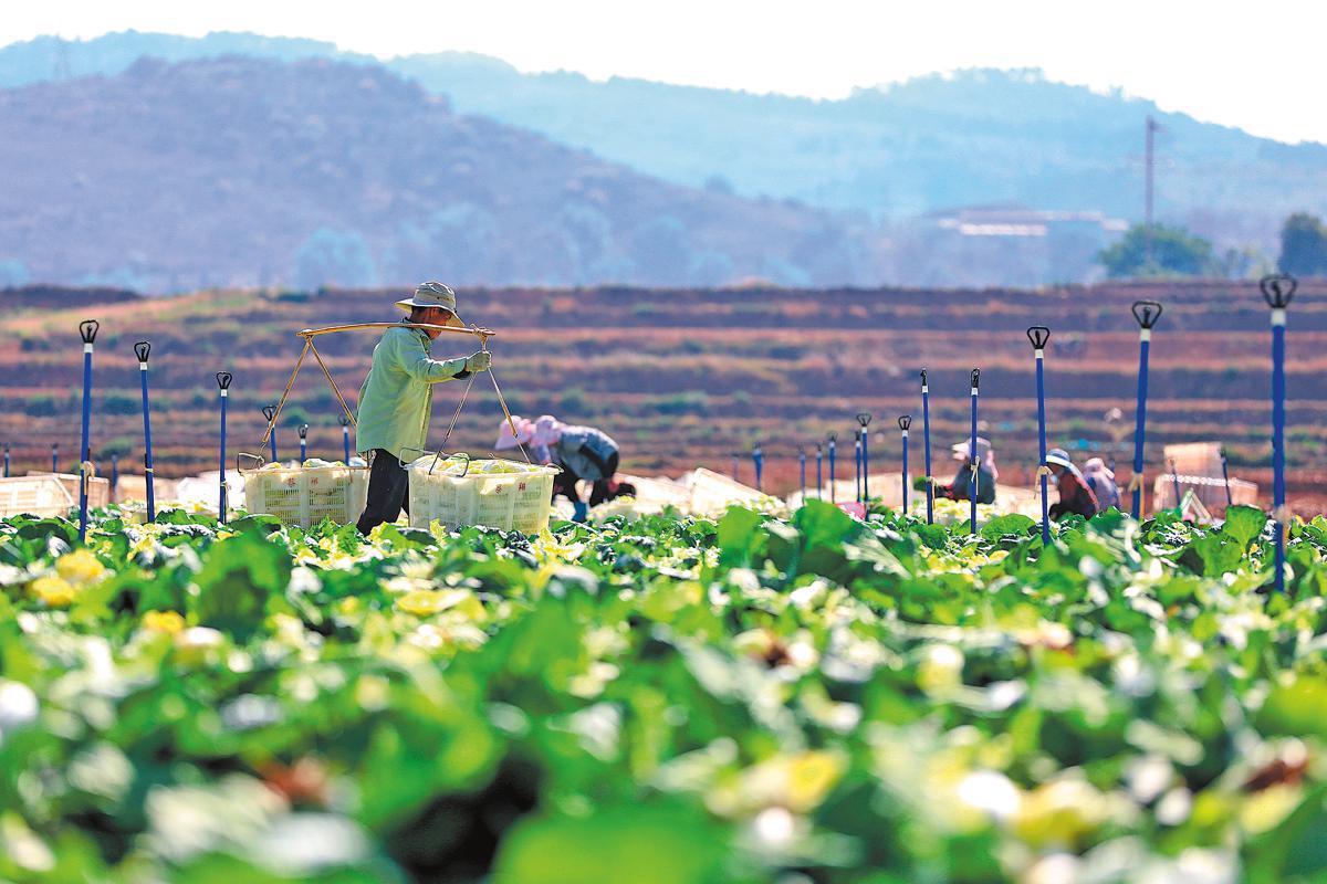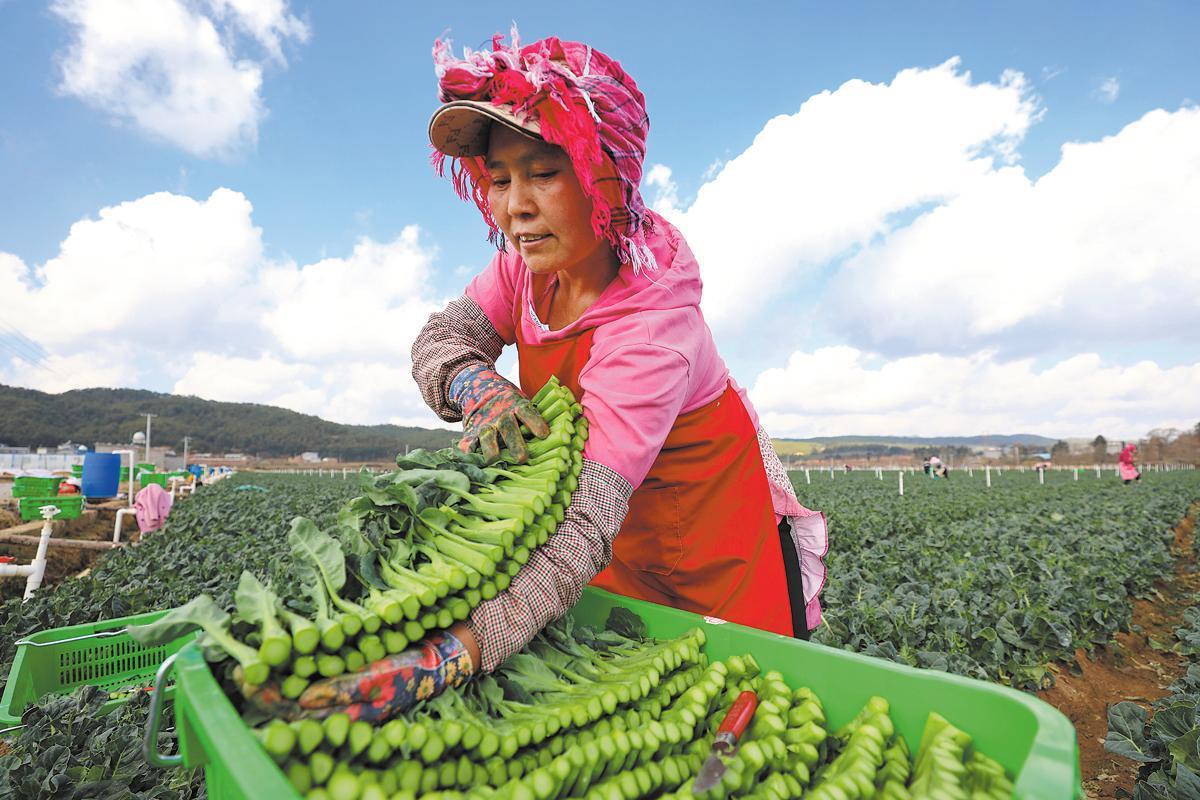 A farmer harvests Chinese broccoli at a plantation in Luliang, Yunnan province, in January last year. WANG YONG/FOR CHINA DAILY