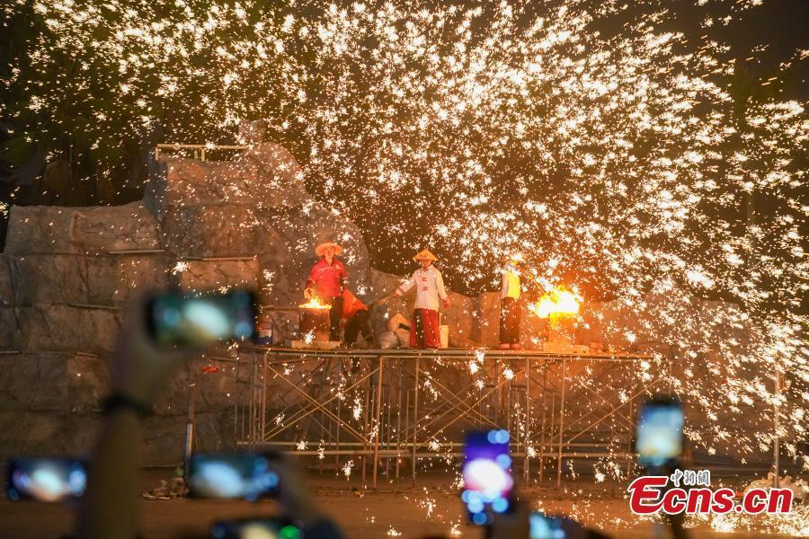 Tourists take photos of the folk art "iron water splashing" in Nanning, South China's Guangxi Zhuang Autonomous Region, Feb. 17, 2024. (Photo: China News Service/Chen Guanyan)