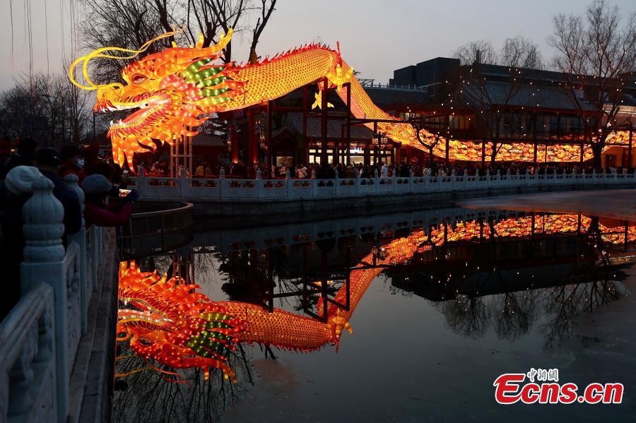 A giant Loong lantern illuminates the night sky at Shichahai scenic area to celebrate the Spring Festival in Beijing, Feb. 17, 2024. (Photo: China News Service/Yi Haifei)
