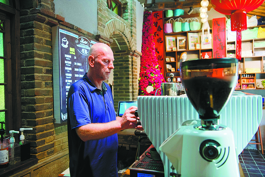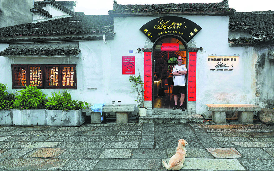 Schober at the front door of his pizza and coffee bar in Hongcun village. It has established itself as a tourist hot spot. [Photo/Xinhua]