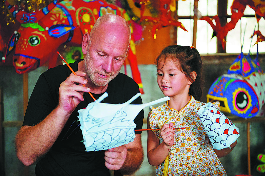 Schober and his daughter Alina carefully paint fish-shaped lanterns at a workshop in Hongcun village. [Photo/Xinhua]