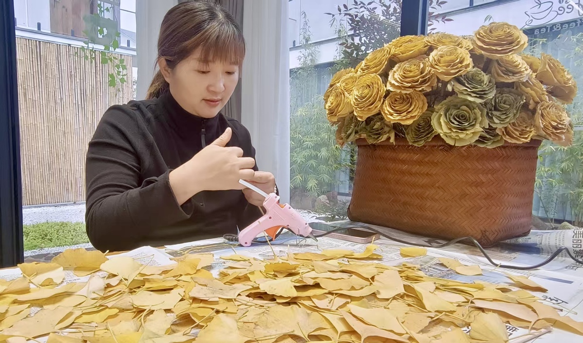 Flowers shaped from gingko leaves are popular with guests at Xu Xianfeng's homestay in Changxing.[Photo provided to China Daily]