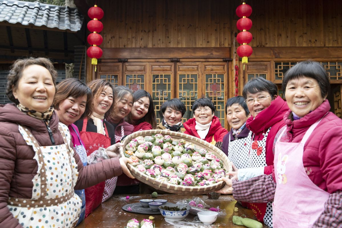 Changxing villagers showcase glutinous rice pastry infused with flower petals.[Photo provided to China Daily]